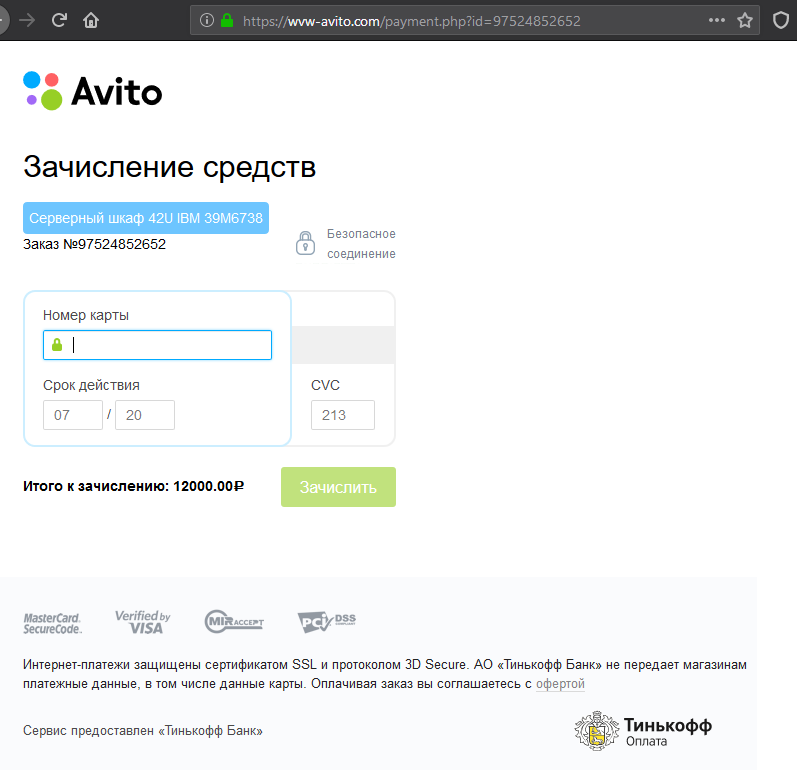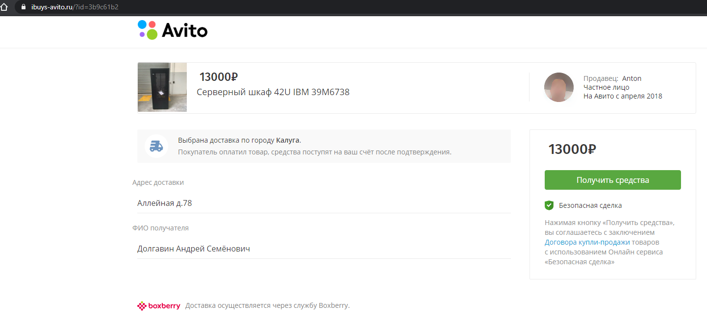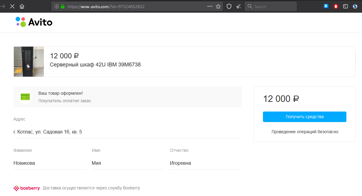 (Мошенник) Приветствую. Серверный шкаф 42U IBM 39M6738 ещё не продали? (Продавец) Еще нет (Продавец) Хотите купить? (Мошенник) Отлично, сразу уточню: в случае если меня всё устроит, (Мошенник) вы сможете отправить его через Авито Доставку? Я из города Котлас. (Продавец) Да, конечно. Я только не умею проводить доставку (Продавец) Не делал никогда (Продавец) А вы с авито? (Продавец) Цену знаете? (Продавец) Это без учёта доставки (Мошенник) Вот правила Авито Доставки (Мошенник) цена 12000 рублей (Мошенник) доставку же я оплачиваю) (Мошенник) Хотела ещё узнать, что именно в нём не идеального?) (Продавец) Пара царапин. А такмкакмновый (Мошенник) Отлично (Мошенник) тогда всё подходит) (Мошенник) сейчас буду оплачивать) (Мошенник) Оплатила) (Мошенник) вам должно прийти смс, для подтверждения сделки