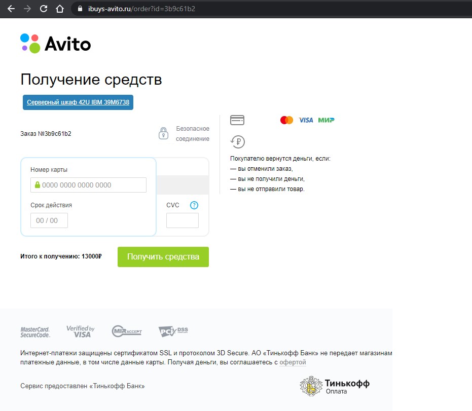 Ну и наконец, В-седьмых, страница оплаты содержит полные данные Вашей банковской карты (дата, CVC, имя), а кнопка "Получить средства" явно является подменой "Подтвердить оплату". Никогда для получения средств не передавайте ничего, кроме номера карты. Даже срок ее действия нужно максимально скрывать от посторонних, тем более в сети.