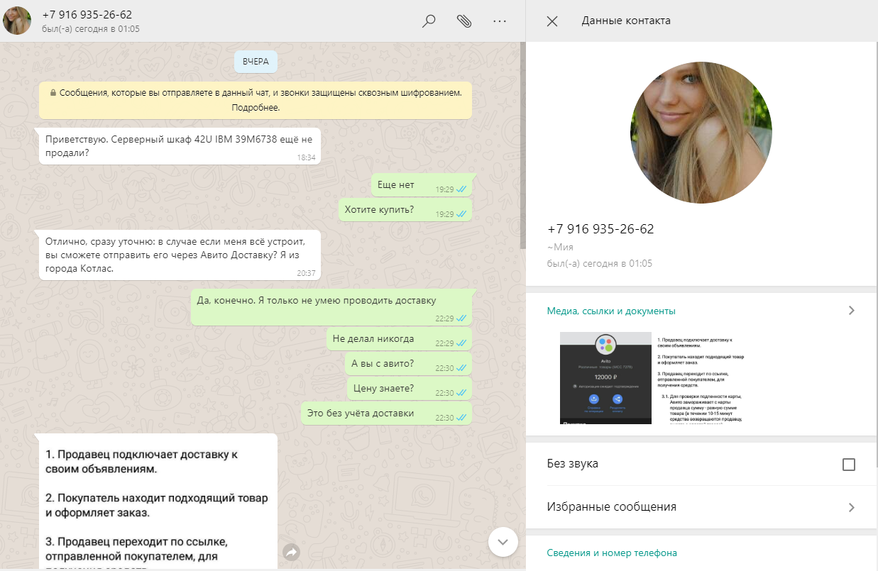 Во-вторых, "покупатель" сразу же переводит диалог в мессенджер. Ему незачем оставлять следы для разбирательств - это чревато преследованием и быстрой блокировкой аккаунта. А то что вы с кем-то там общались в Whatsapp, вы уже никогда никому не докажете.