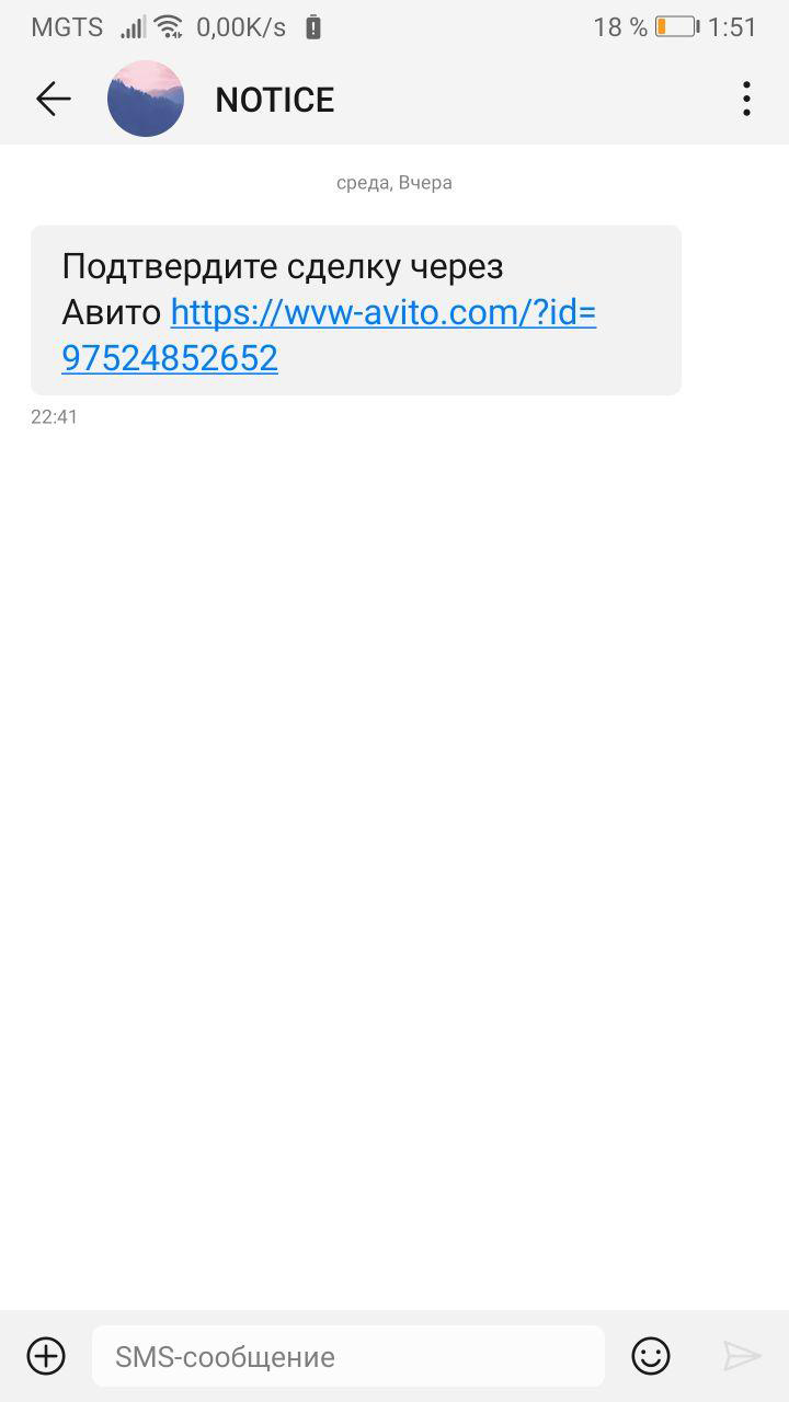 Приходит SMS от "NOTICE" с текстом: Подтвердите сделку через Авито https://wvw-avito.com/?id=97524852652